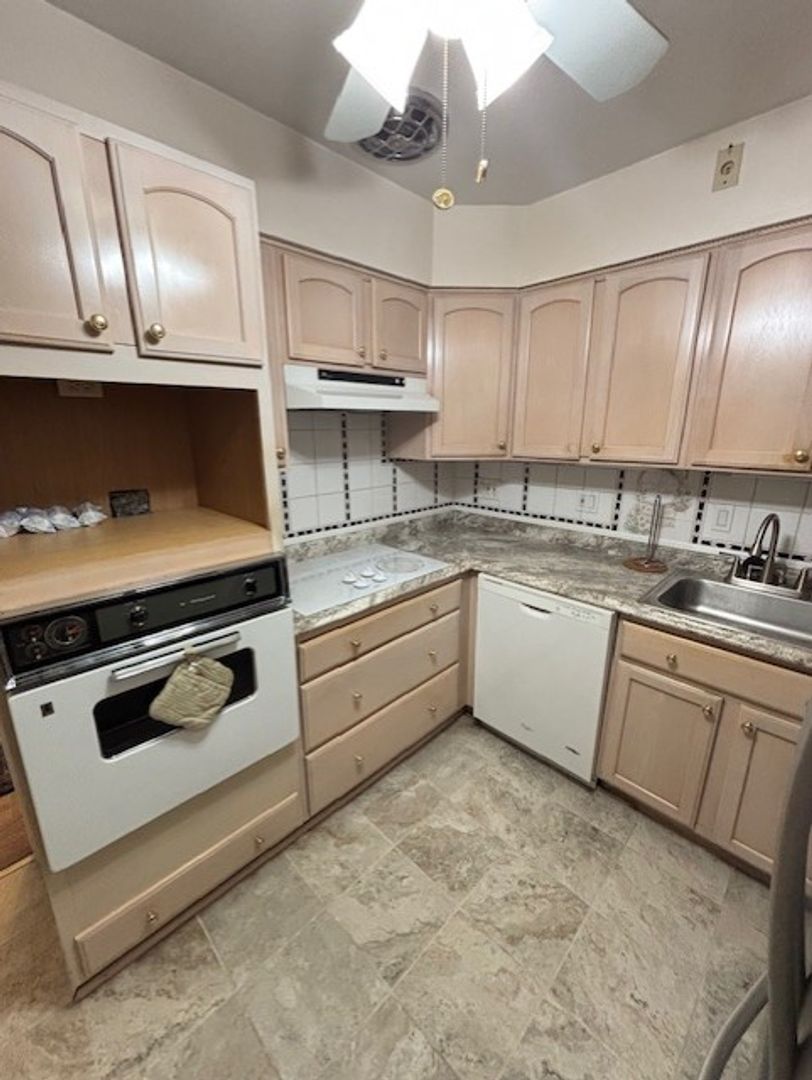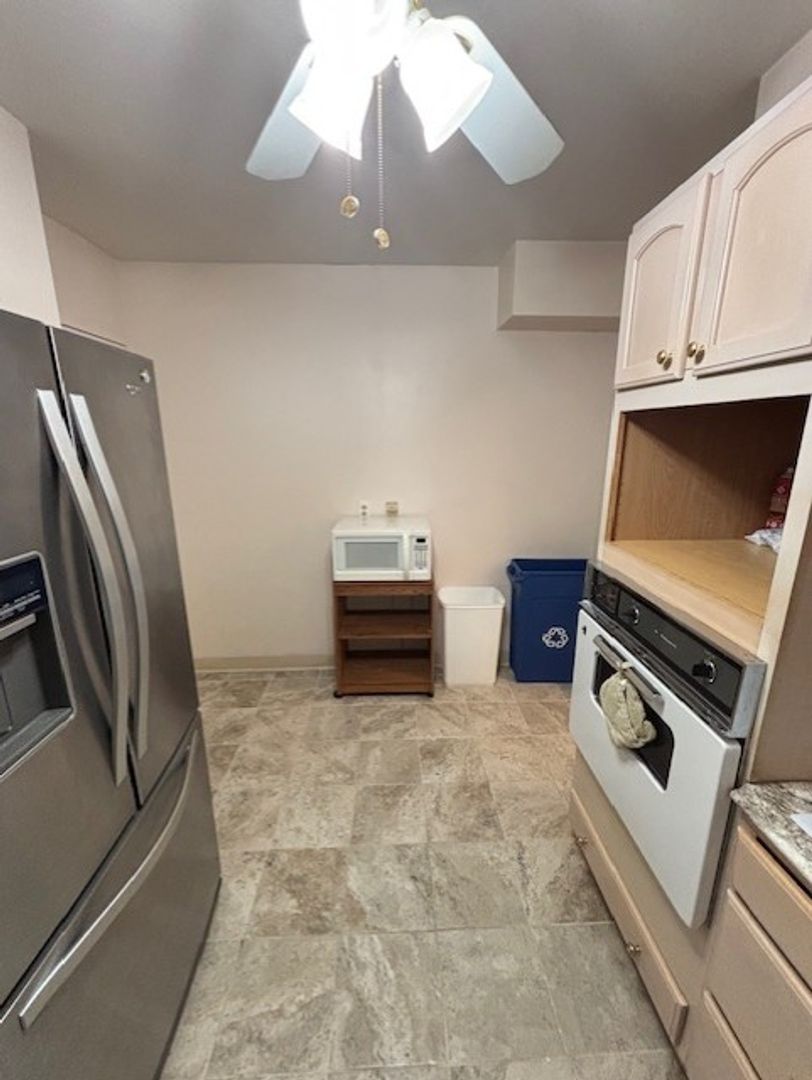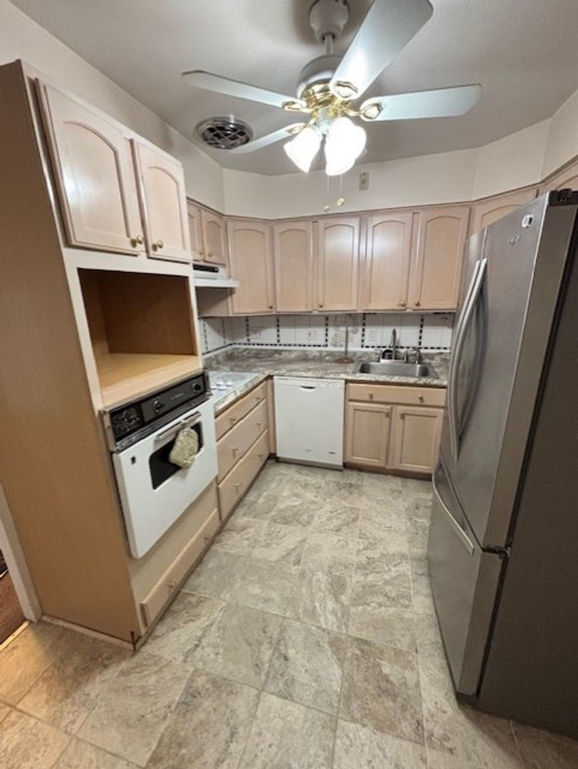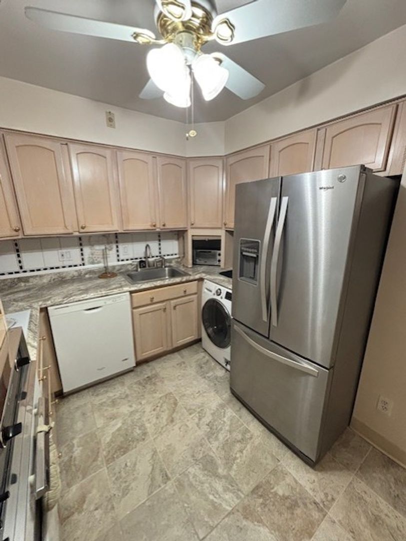 Appliances included are refrigerator, stove, dishwasher and microwave. Coin-operated washer and dryer in building.