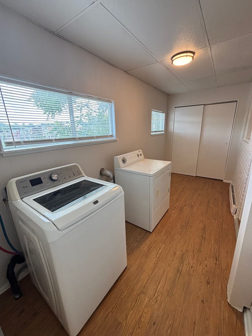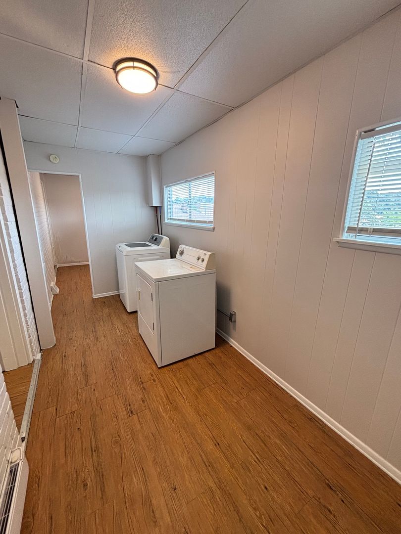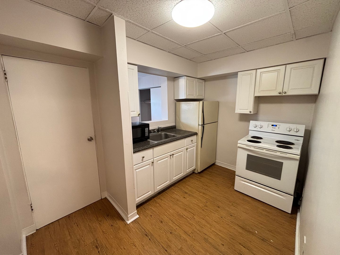 Appliances included are refrigerator, stove, microwave, washer and dryer.