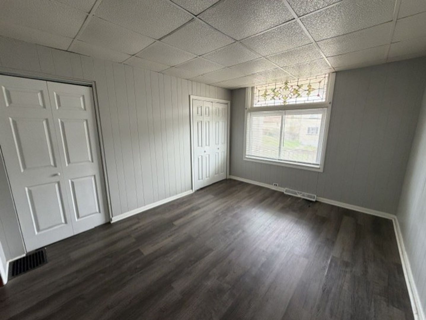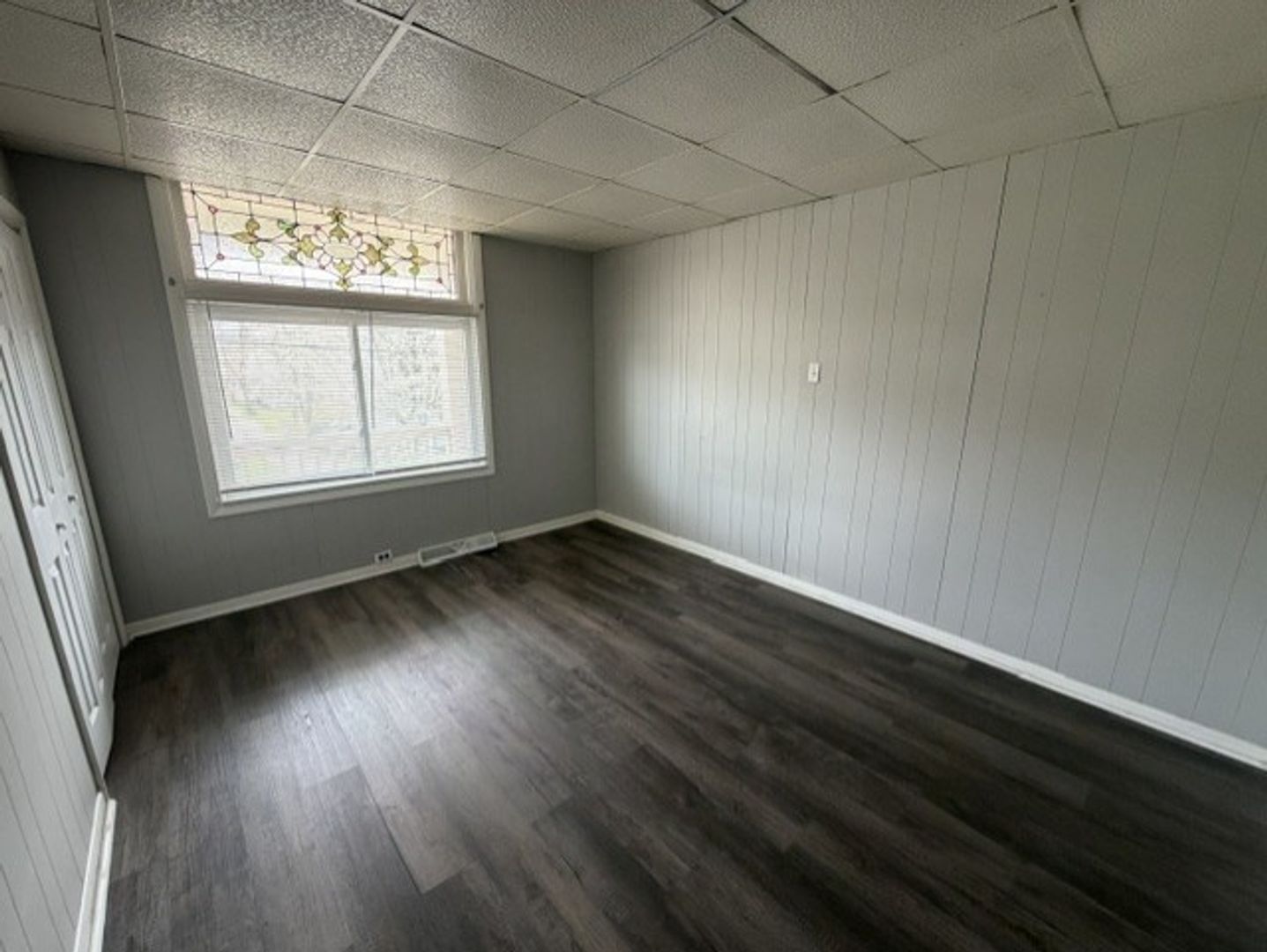 - Sun-filled bedroom with stained glass artwork above window